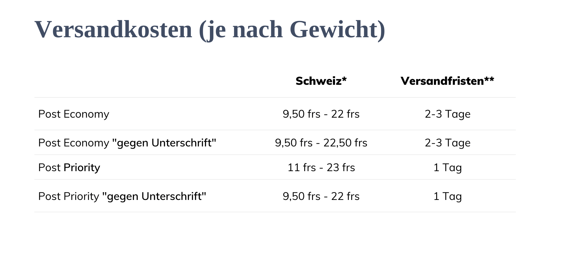 * Für Sendungen ins Ausland gelten andere Tarife und Fristen. Die für Ihre Region geltenden Tarife finden Sie, sobald Sie bei der Bestellung Ihre Lieferadresse angegeben haben.